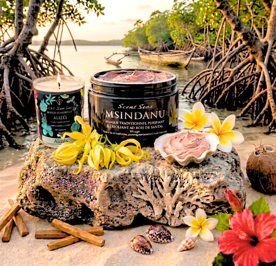 Le Msindanu, masque visage traditionnel des Comores et de Mayotte, présenté ici avec sa texture et sa pierre de corail, symbole de nos rituels insulaires revisités par Scentseas.