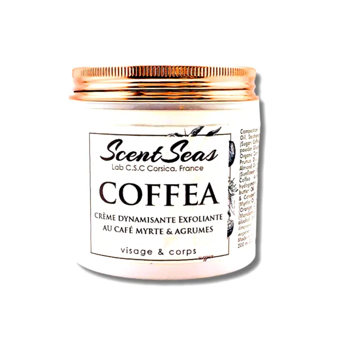 Coffea exfoliant énergisant et dynamisant agrumes, le myrte s’inscrivant dans la synergie globale des îles,