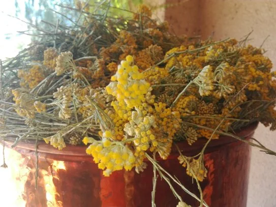 En hiver, après de longues journées dans le froid, un peu d'huile d'Immortelle diluée soulage nos courbatures et réchauffe nos membres. C'est une partie intégrante de notre pharmacopée familiale.