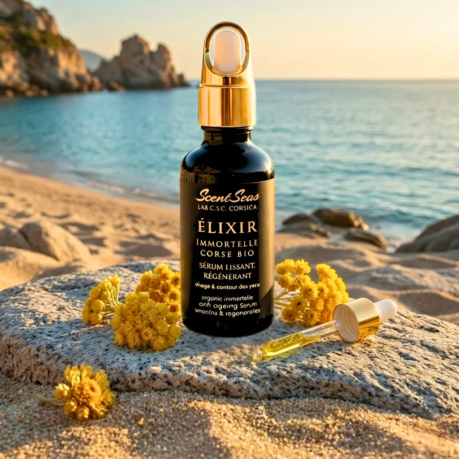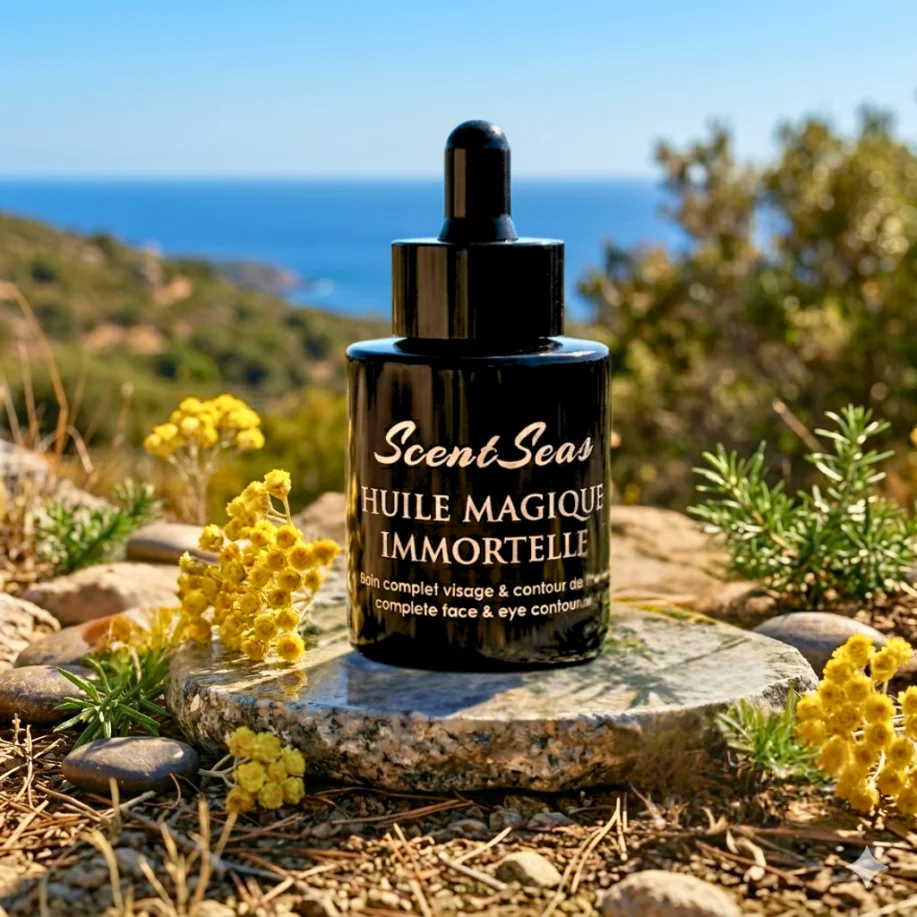 Soins visage et corps enrichis en huile d’immortelle de Corse, reconnue pour ses propriétés anti-âge et réparatrices.